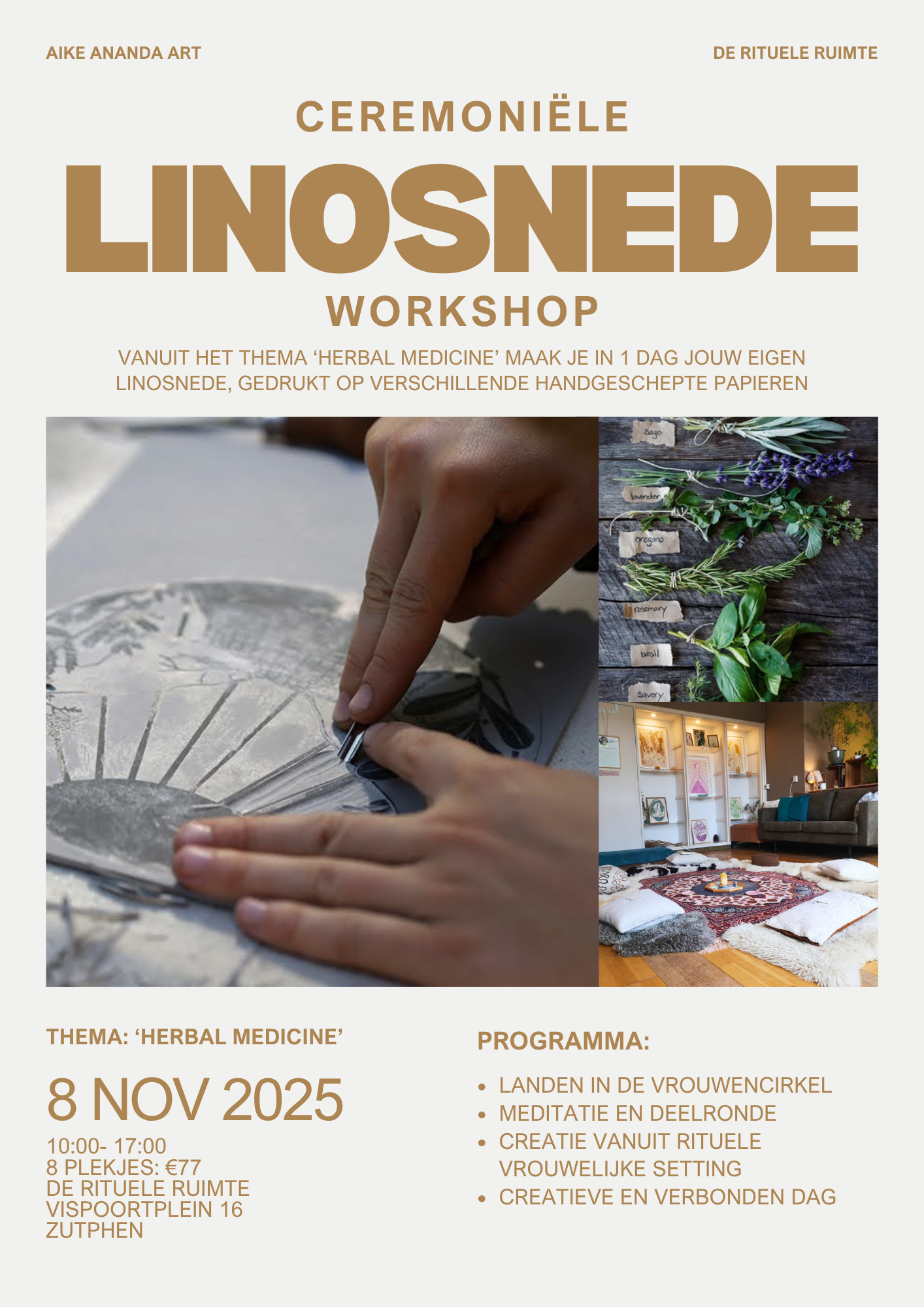 In deze workshop maak je zelf een linosnede met als thema 'HERBAL MEDICINE'. Er zullen planten en kruiden aanwezig zijn om na te tekenen en mee te verbinden. Er is ruimte om te delen, zakken in een meditatie en je onder te dompelen in jouw unieke creatiekracht. Aike combineert ceremonie met creativiteit en bied een veilige plek om jou vrouw-zijn én creativiteit te ontdekken.