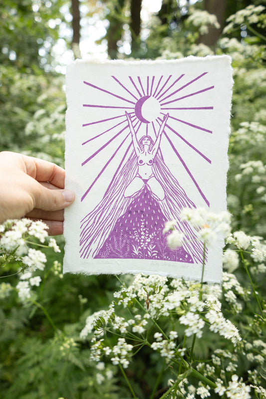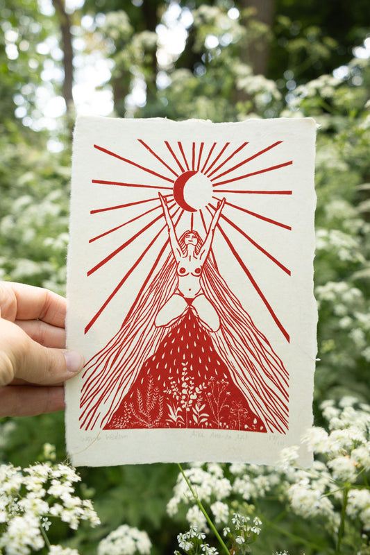 Linoleum prints verbonden met de vrouw, de kosmos en de aarde.