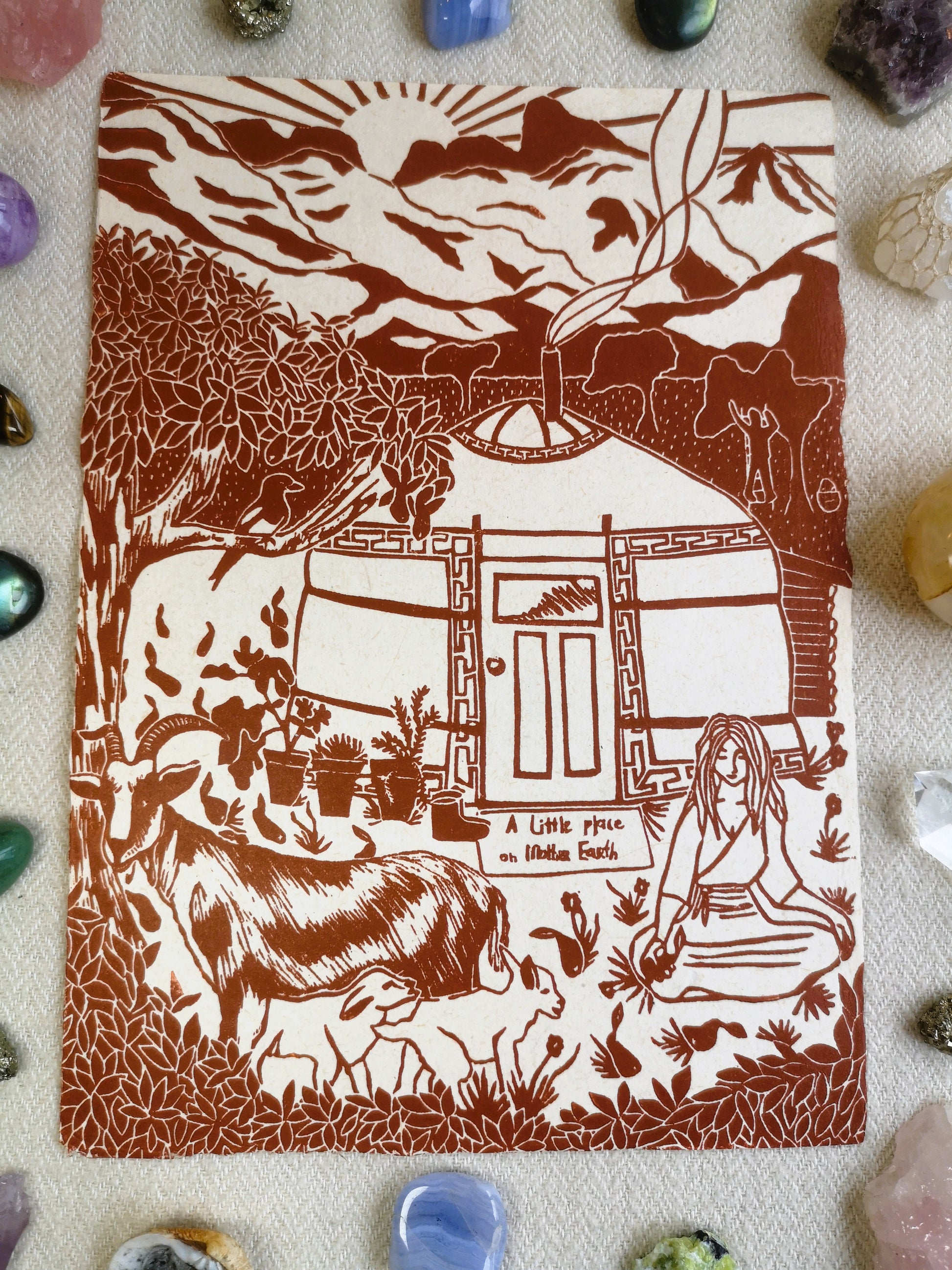 'A little place on mother earth' is geïnspireerd op mijn ervaring van het wonen in een yurt/ ger. De print is een idyllisch plaatje vol simpele overvloed (perenbomen, boomgaard en geiten). Het laat zien dat je met een klein plekje op de aarde en een simpel leven gelukkig kan zijn.