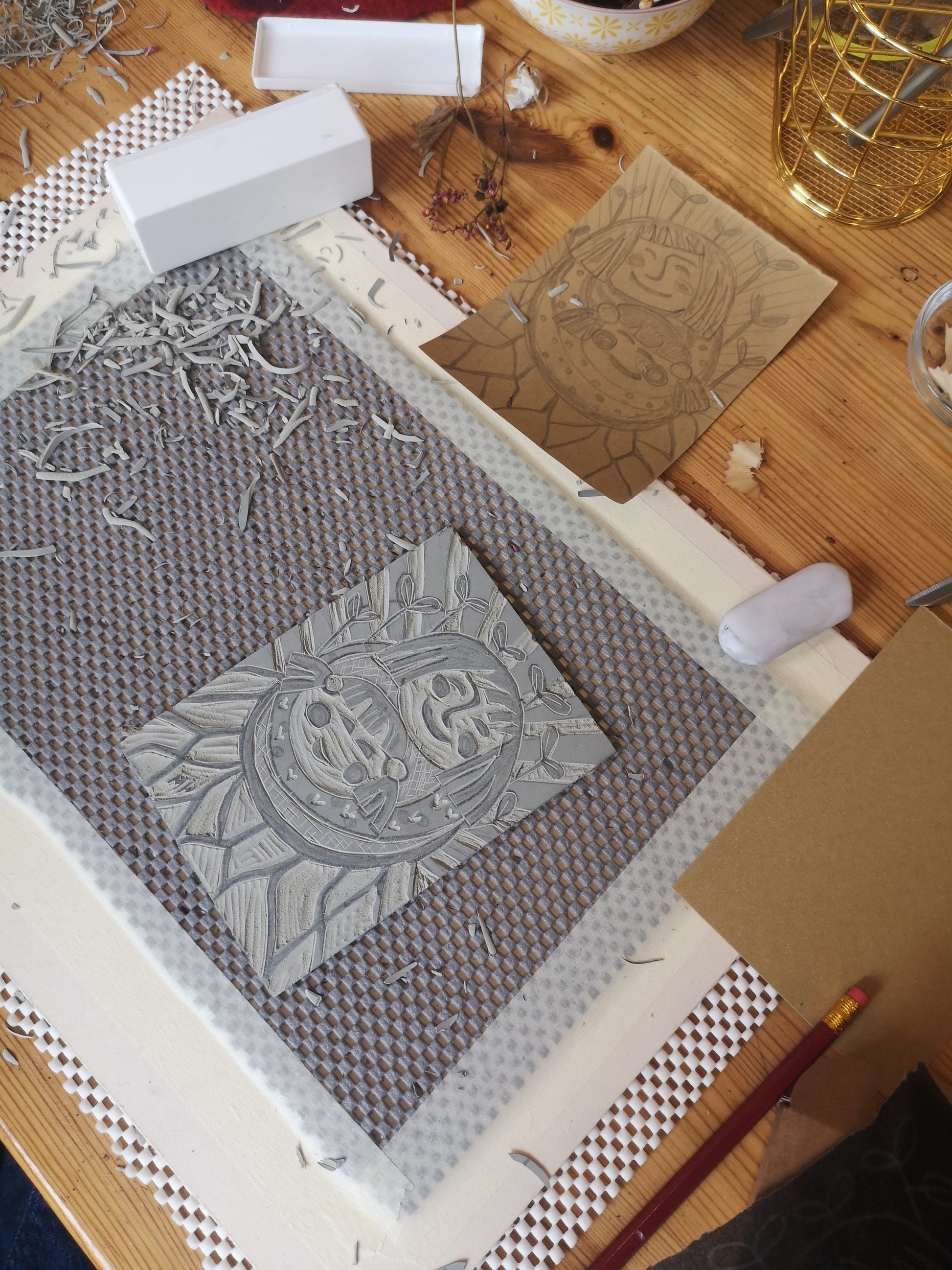 In een middag maken we een linosnede van begin tot eind op A6 formaat.