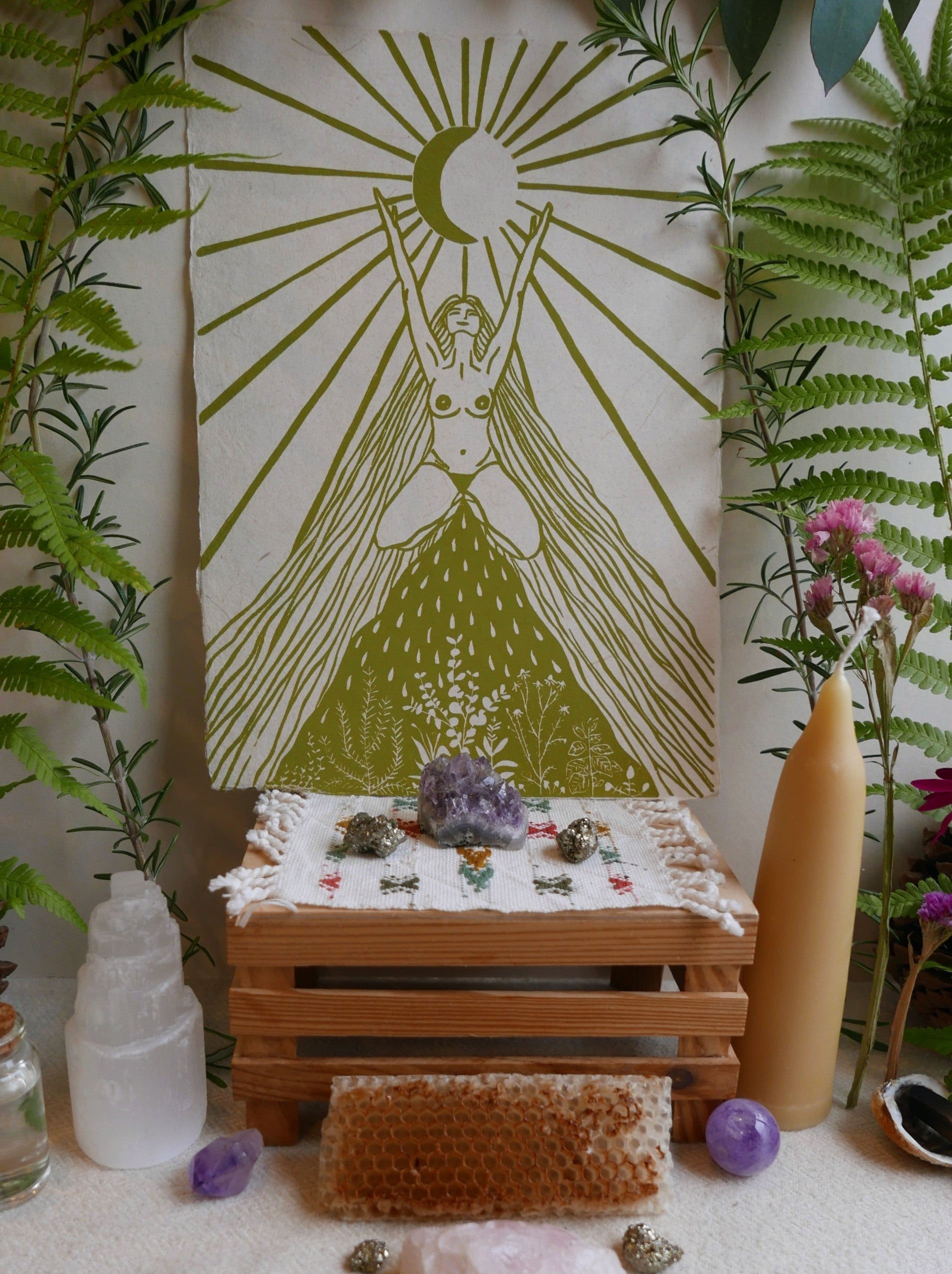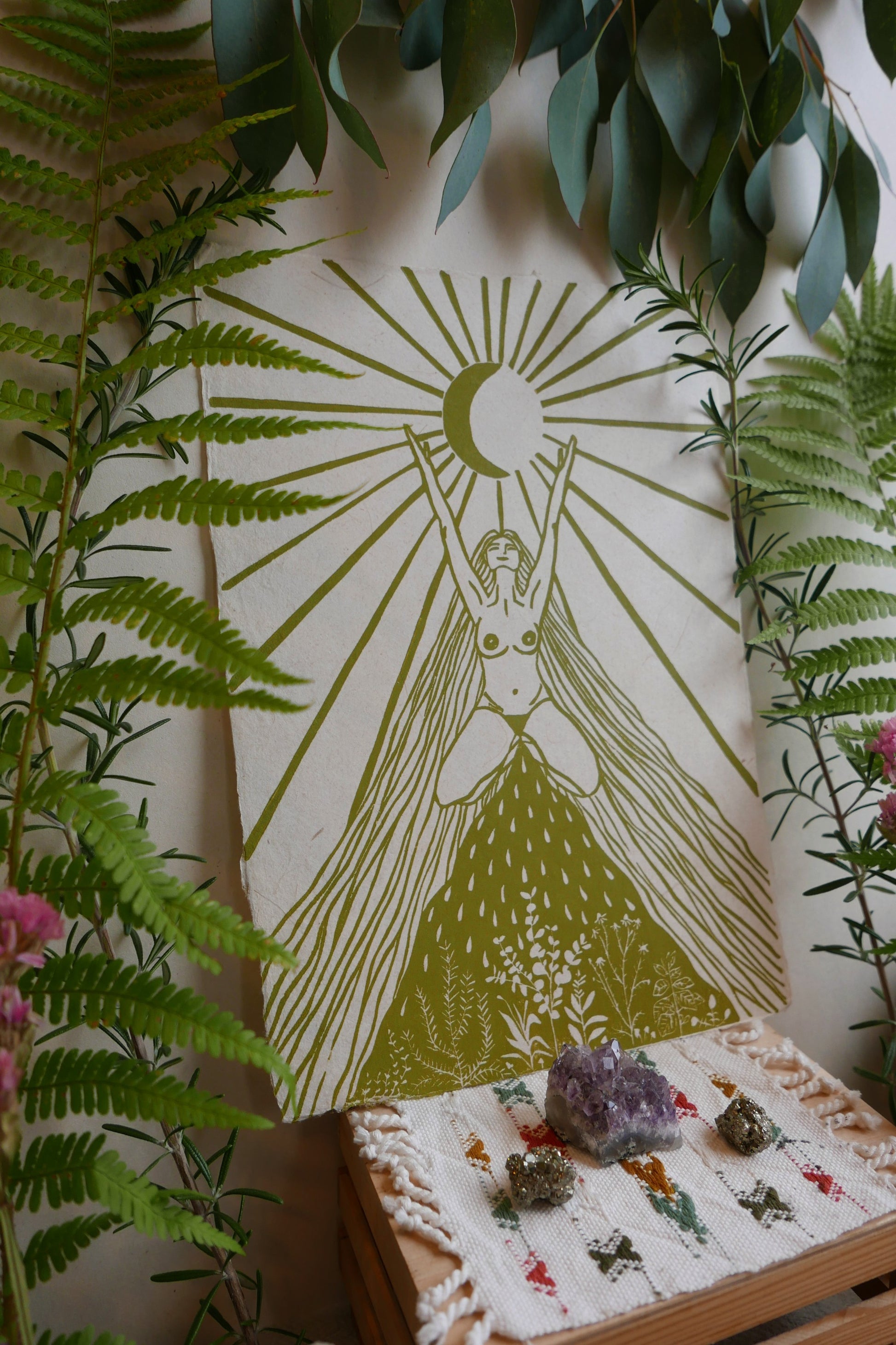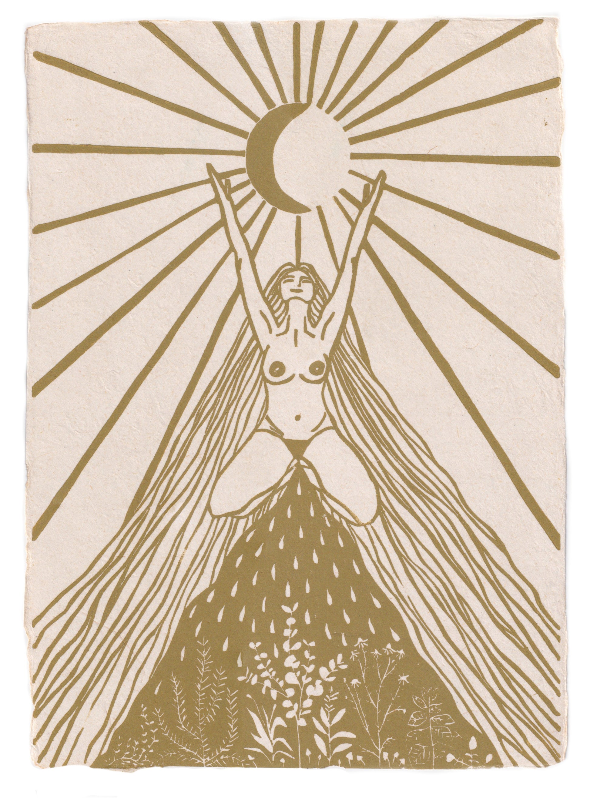 Ik ontving deze print tijdens mijn maantijd. Ik voelde een sterke kracht die me verbond met de aarde, mijn bloed. Tegelijkertijd voelde ik me volledig open en vol overgave naar het universum.